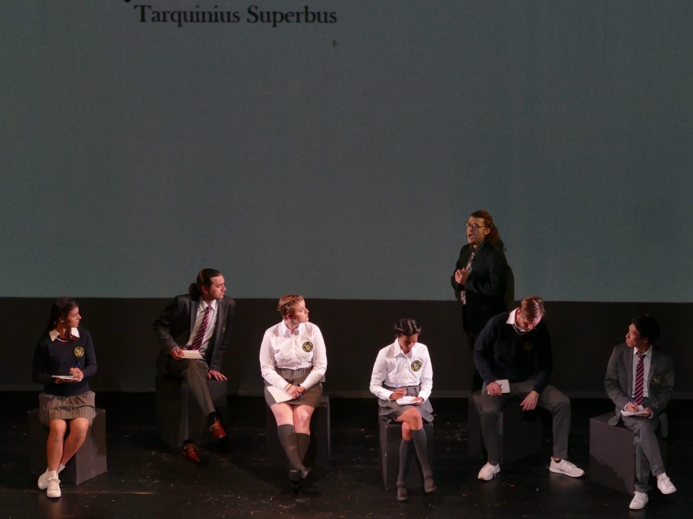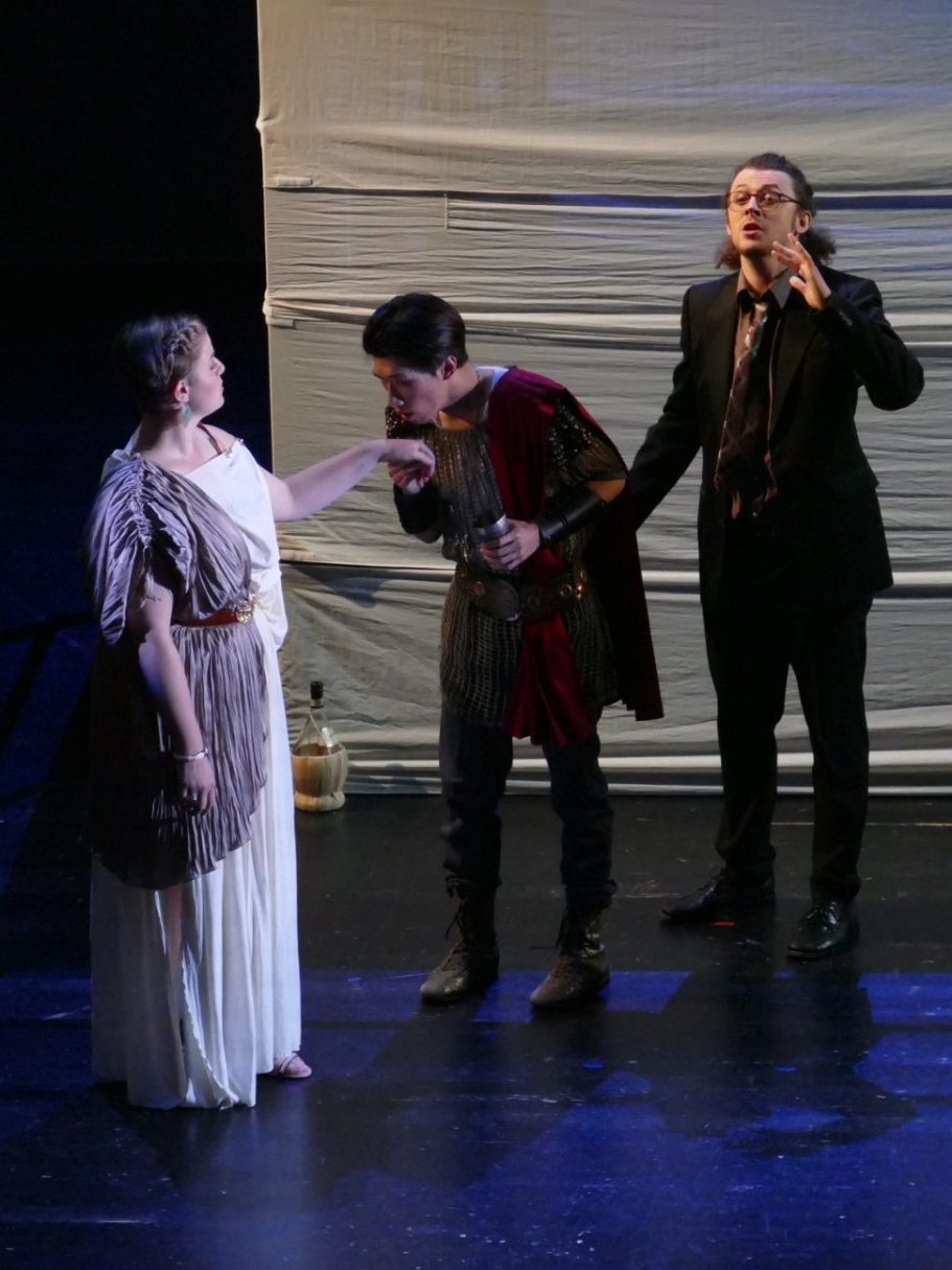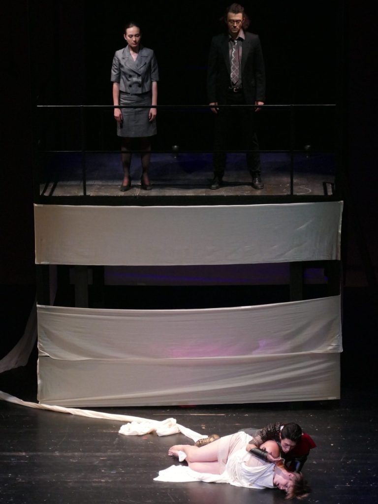 Unsere Regisseurin Katharina Thoma wollte eine gewisse Distanz zur grauenvollen und hochdramatischen Geschichte der Vergewaltigung der Lucretia (510 v. Chr.) erzeugen. So fungierten in dieser Inszenierung der Male und der Female Chorus als Lehrpersonen, die mit einer Klasse von Studierenden (darunter alle anderen Figuren) die Ereignisse (wie eine Schultheaterinszenierung) nachstellen. Dieses Vorhaben gerät allerdings aus den Fugen und alle Beteiligten lassen sich zu sehr von der Handlung mitreißen und verlieren sich in ihren Charakteren.