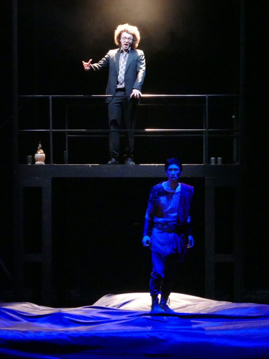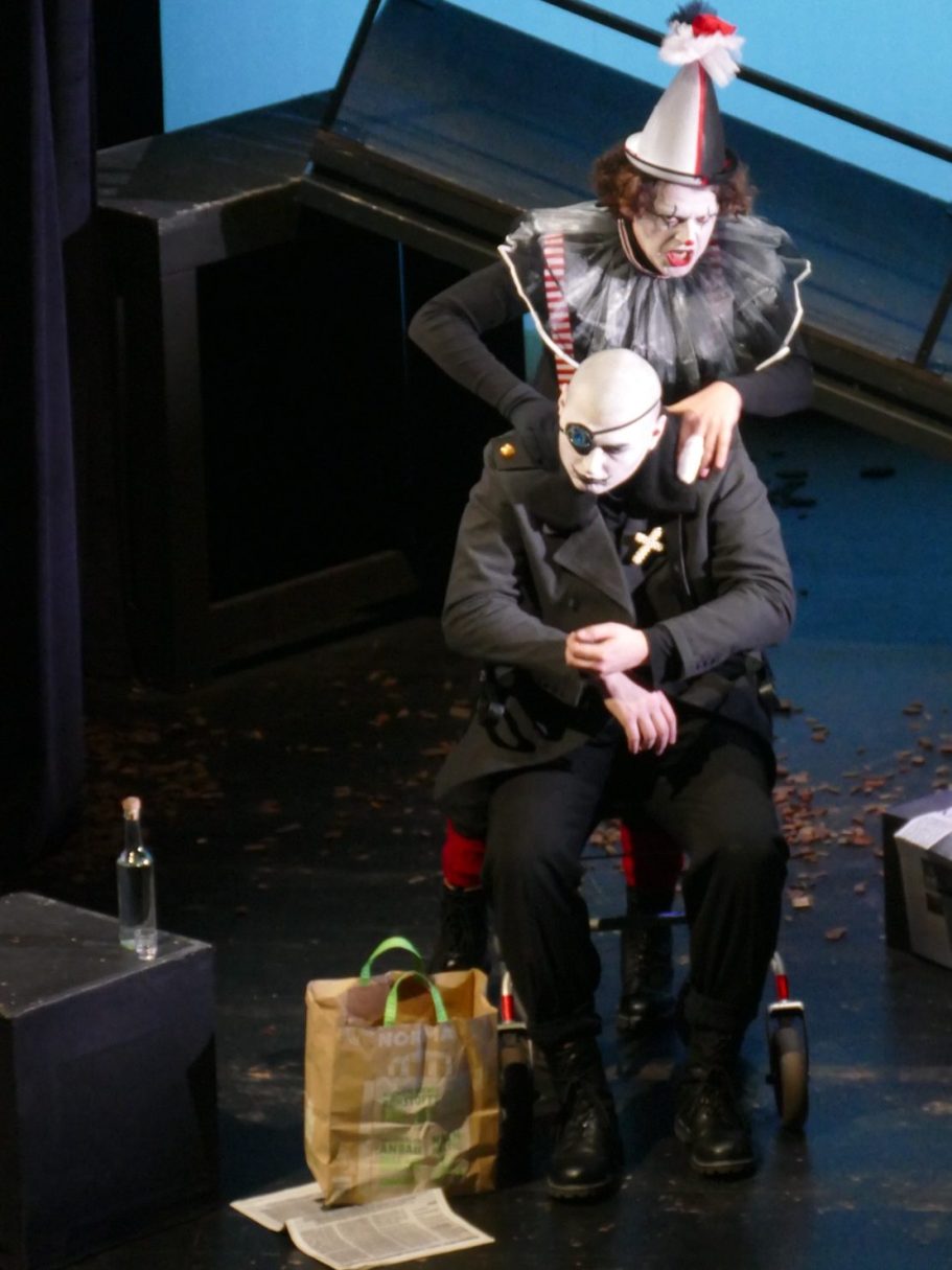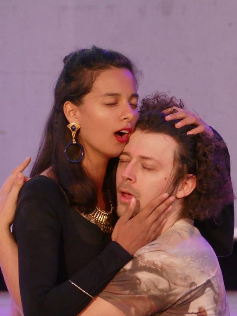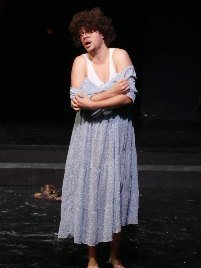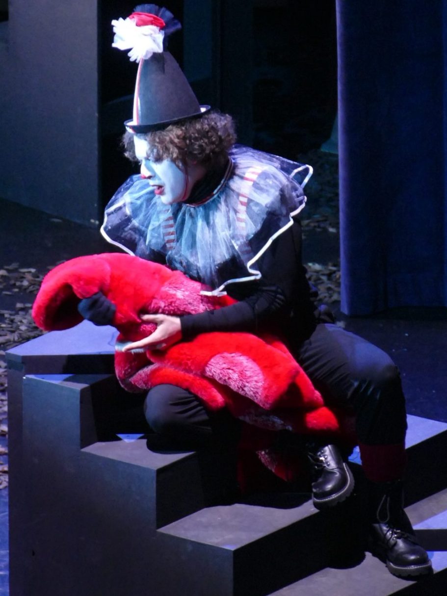 Unsere Regisseurin erweiterte das eigentlich rein freundschaftliche Bündnis zwischen Orpheus und Eurimedes. So wird sich Eurimedes in dieser Inszenierung bewusst, dass er echte Gefühle der Liebe für Orpheus entwickelt und damit seine geschlechtliche Identität hinterfragt. Er will Orpheus gefallen und beginnt daraufhin Frauenkleider zu tragen und sich zu schminken. Als Orpheus aber immer tiefer und wahnhafter in die Unterwelt hinabsteigt, um seine Geliebte zu retten, erkennt Eurimedes die Sinnlosigkeit seiner Bemühungen und zerreißt aus Frust sein Kleid und beklagt seine wechselhaften Gefühle und unerfüllten Hoffnungen.