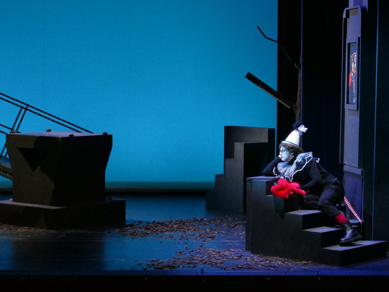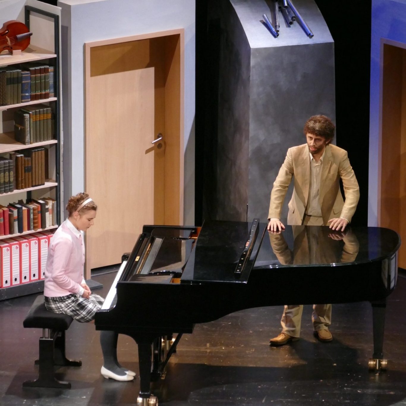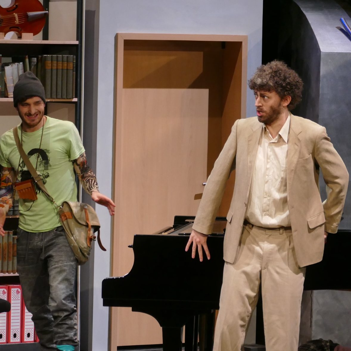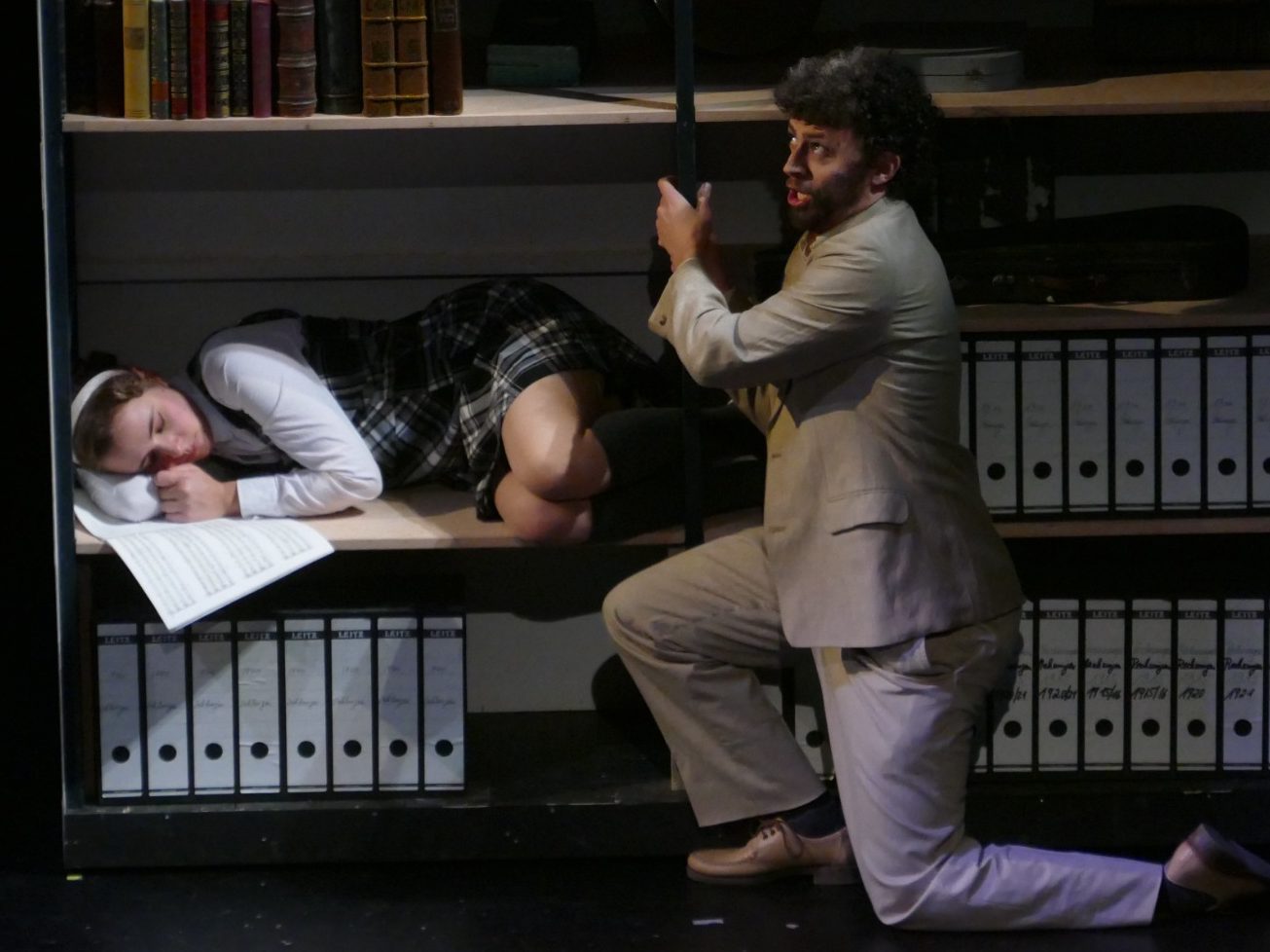 Die Figur in Mozarts „Die Zauberflöte“ gilt heute aufgrund tief verwurzelter rassistischer Stereotype des 18. Jahrhunderts als hochgradig problematisch. Unsere Regisseurin wollte -wie es eine zeitgemäße Inszenierung verlangt- diese rassistischen Elemente durch eine neue Deutung entschärfen, indem sie Monostatos als Außenseiter aufgrund seines Charakters darstellte, statt seine Handlungen an seine Herkunft zu koppeln. So kam es, dass Monostatos nicht als schwarzer Sklave, sondern als machtmissbrauchender Hochschuldozent inszeniert wurde, der sich an seinen Schülerinnen vergriff. Es war für mich eine große Herausforderung, jedes Mal aufs Neue eine möglichst unangenehme "Klavierunterrichtsszene" zu erzeugen. Die Regisseurin ließ mir dabei sehr viel Freiheit und setzte lediglich einen Rahmen für den szenischen Ablauf. Der Text variierte von Vorstellung zu Vorstellung und wurde von mir mehr oder weniger improvisiert. Meine Opfer bzw. Spielpartnerinnen (das waren die beiden Pamina Besetzungen) hatten es mit mir also nicht leicht...
